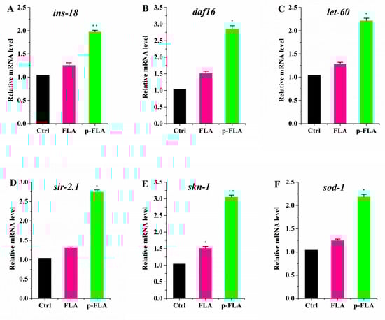Anti-aging and antioxidant effect of FLA and p-FLA in C. elegans. (A)–(D): 2 mg/mL p-FLA extracts significantly increased the expression of ins-18, daf-16, let-60 and sir-2.1, which are key anti-aging genes; (E): 2 mg/mL p-FLA extracts up-regulate skn-1 expression; the effect was three times greater than FLA extracts; (F): 2 mg/mL p-FLA extracts increased the expression of antioxidant enzyme sod-1 significantly. Error bars represent means ± SEMs (* p < 0.05, ** p < 0.01).