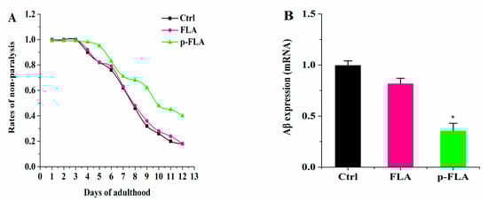 Alzheimer’s disease (AD) is widely recognized as a common aging-related neurodegenerative disorder. AD is thought to be caused by the production and deposition of neurotoxic Aβ-peptide in the brain. Therefore, the focus of research in toxic Aβ clearance is one approach for the treatment of AD. Therefore, in order to further evaluate the anti-aging effect of FLA and p-FLA, we used the Aβ-expressing nematode model strain CL2006 to investigate the effect of FLA and p-FLA. This transgenic nematode strain expresses the human 42 amino acid sequence of Aβ under the control of the muscle-specific unc-54 promoter of C. elegans and responds to Aβ expression with increased paralysis. The worms were treated with FLA and p-FLA at a concentration of 2 mg/mL from Day 1 to Day 12. Then, paralysis of the worms was analyzed, and total RNA was extracted to check the Aβ expression. From the results, p-FLA significantly delayed Aβ-induced paralysis in this transgenic worm, while FLA had no obvious influence (Figure 7A). Consistently, the level of Aβ was reduced by half with the treatment of p-FLA rather than FLA (Figure 7B). Therefore, in this AD model strain, p-FLA showed a better anti-aging effect.