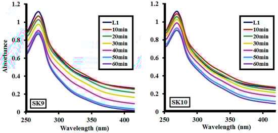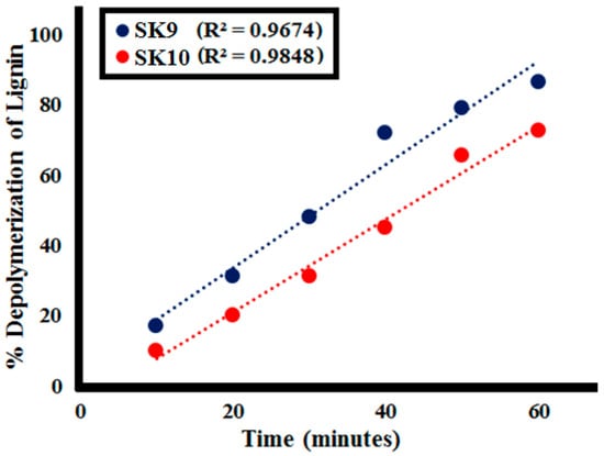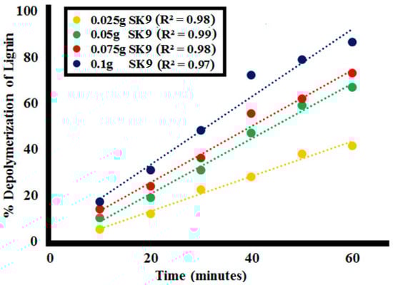 | Time | %Lignin (L1100ppm) Depolymerization at Different Catalyst Doses of SK9 | |||
