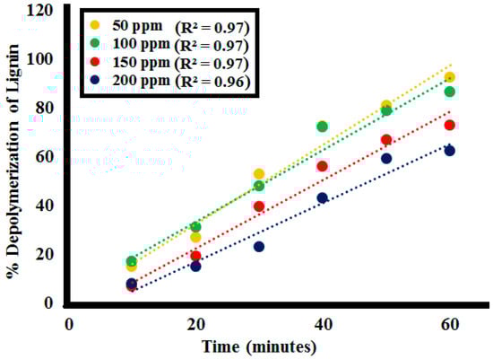 | Time | %Lignin (L1) Depolymerization at the Different Lignin Concentrations | |||