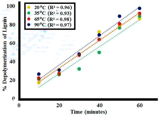 | Time | %Lignin (L1100ppm) Depolymerization at Different Temperatures | |||
