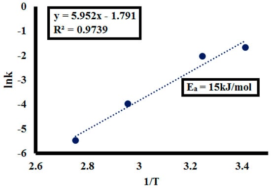 | Temperature | Rate Constant (k) (g−1min−1) | R2 |