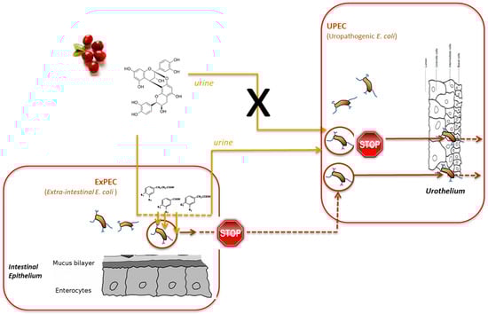 More specifically in relation to UTIs, and as it is becoming evident that the intestine is a reservoir for uropathogenic bacteria, in vitro studies have indicated that cranberry flavonoids and phenolic acids might interact with extra-intestinal E. coli (ExPEC) and decrease its (transient) intestinal colonization, consequently reducing the risk of UTI incidence [72]. This potential mechanism of action of cranberry polyphenols against UTIs is also depicted in Figure 2.