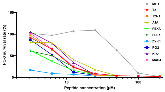 Plots of the activities of peptides T2, T2R1, A1A, PEXA, FLEX, ZYK1, PG2, KIA1, and MAPA compared to MP1 (control) on PC-3 prostate cancer cell line.
