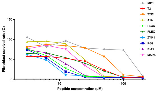 Plots of the activities of peptides T2, T2R1, A1A, PEXA, FLEX, ZYK1, PG2, KIA1, and MAPA compared to MP1 (control) on human primary dermal fibroblasts.
