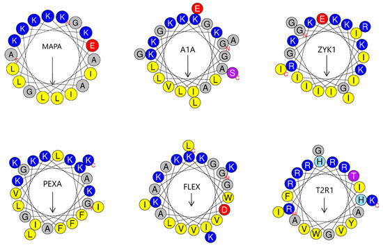 The Schiffer−Edmundson wheel projection of the six best anticancer peptide antibiotics: ZYK1, A1A, MAPA, T2R1, FLEX, and PEXA, drawn by using the HeliQuest tool. See Table 1 for peptide abbreviations. Color code follows the HeliQuest convention: yellow for hydrophobic, blue for cationic, red for anionic, grey for small amino acids, purple for uncharged polar residues, and light blue for histidine. The arrow length and direction indicate that the mean hydrophobic moment vector is fairly strong for all peptides, pointing toward the hydrophobic helix face.