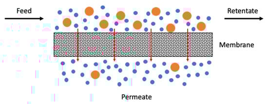 A membrane can be defined as a selective barrier between two streams or an interface between two phases [], see Figure 1. The membrane is the nucleus of a membrane separation process. This separation process consists of dividing the feed stream into two streams: the retentate stream and the permeate stream. The final product to be separated can be obtained in the permeate stream or in the retentate (or concentrate) stream. The separation occurs because the membrane is selective towards one or more components of the feed stream, allowing them to pass through. In gas separation applications, the gradient in chemical potential between both sides of the membrane is the force that drives the different species to permeate a membrane. This gradient in chemical potential can be translated into partial pressure difference.