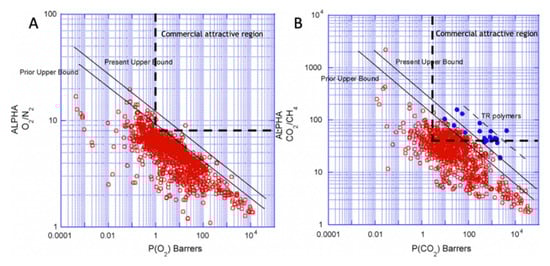 Robeson upper bound plots for O2/N2 separation (A) and for CO2/CH4 separation (B) with their industrial application attractive region, where the carbon molecular sieve membranes (CMSMs) are included (adapted with permission from [,]).
