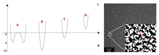 (I) Graphic representation of the gas molecules interaction within a pore or constriction. (A) There is no overlap of the potential associated with the opposite walls because the pore is too large; (B) As the opening of the pore increases, maximum absorption energy is reached, and the potential reaches a minimum; (C) The pore becomes a constriction and the sorption energy is smaller; (D) The potential becomes positive and the pore is impervious to the species; (II) real pore configuration (adapted with permission from []).
