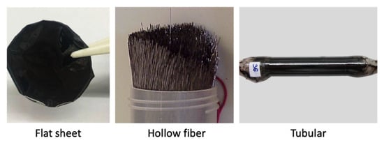 A CMSM can be either self-supported or supported in a porous and mechanically stable material []. The supported membranes can be flat or tubular while the unsupported membranes can be flat, capillary or hollow fibers (Figure 5).
