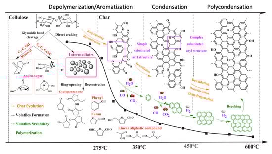 Cellulose is a thermosetting polymer and then does not melt during the carbonization processes. Thus, high temperature heating of cellulose, even in an inert atmosphere, results in a complex series of chemical reactions. The pyrolysis mechanism of cellulose has been previously studied by different authors [,,,]. Among these studies, one deserves special attention, namely a very recent work by Yang et al. [], who studied the carbonization of cellulose in the temperature range 200–600 °C using two-dimensional perturbation correlation infrared spectroscopy (2D-PCIS). The cellulose carbonization process is represented in Figure 8. In the lower temperature range (≤275 °C), some cracking of C-OH and C-H structures occurs around the pyran ring, but the molecular and crystal structure of cellulose suffers only minor changes. With the temperature range increasing, 275−350 °C, some glycosidic bonds are broken to form dehydrated sugars and pyranone products and the crystal structure of cellulose is completely decomposed. At 350 °C, the char consists mainly of aromatic and alicyclic compounds rich in C=O groups. In the next temperature range (350−450 °C), glycosidic bonds are rapidly broken, decarbonylation reactions of char take place with largely increased amounts of CO and CO2 released as gas products. At the same time, substitution reactions between aromatic rings in the char create an amorphous three-dimensional (3D) network structure containing a large number of low-order fused rings (two−five rings). Finally, in the range 450−600 °C, a further removal of oxygen occurs, containing groups and alkyl structures in the char, creating gas products such as CO and CH4. Dehydrogenation and condensation reactions between benzene rings and dense small-molecule rings form higher-order fused rings with a release of a large amount of H2.