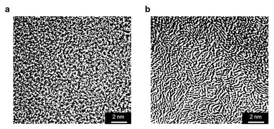 Recently, in 2019, the same group reported a new work on CMSM based on cellophane paper precursor []. Rodrigues et al. [] presented a CMSM with extremely high separation performance: the CMSM carbonized at 600 °C is situated far above Robeson’s upper bound, showing a O2/N2 selectivity greater than 800, a CO2/CH4 selectivity greater than 2600 and a H2/CH4 selectivity greater than 25,000, but with low permeability. These cellulose-based CMSM shows the highest Robeson Index values for the O2/N2 and CO2/CH4 separations, 63 and 100, respectively. X-ray photoelectron spectroscopy (XPS) and Inductively coupled plasma (ICP) analyses proved the presence of metallic and semi-metallic groups (ionic sodium and silica nanoparticles) homogeneously distributed on the membrane surface, providing polar sites that allow the water molecules to jump between them avoiding the formation of water clusters []. This confers a very high humidity stability to these membranes (absence of pore blockage) and a very high water vapor permeability. The permeability of C3H6 and C3H8 was also measured, but the ideal selectivity attained was very low compared to the literature values for this separation. The cellulose-based CMSM nanostructure was compared, as studied by High-resolution transmission electron microscopy (HR-TEM), with the nanostructure of a phenolic-resin based CMS adsorbent produced by the same authors and displaying, respectively, high and low ideal selectivity to C3H6/C3H8 and O2/N2 mixtures. Interestingly, the membrane sample with high O2/N2 selectivity presented a morphology with gate-like pores, which is characteristic of a gate sieving mechanism, see Figure 9a, whereas the CMS adsorbent presented interconnected pores in form of earthworm-like pores, characteristic of a tubular sieving mechanism, see Figure 9b.