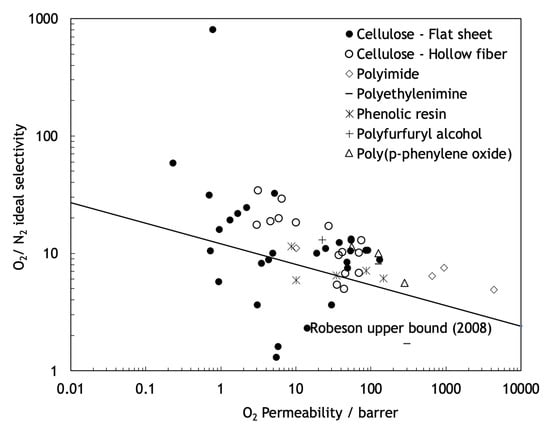 Cellulosic precursors display several advantages over other polymeric precursors including a higher availability, a lower cost and an environmentally-friendly processing. Furthermore, cellulose-based CMSMs, compared with CMSMs derived from other precursors, have higher permeability and selectivity to several permanent gases such as natural gas separations [,,,], as can be seen in Figure 7.