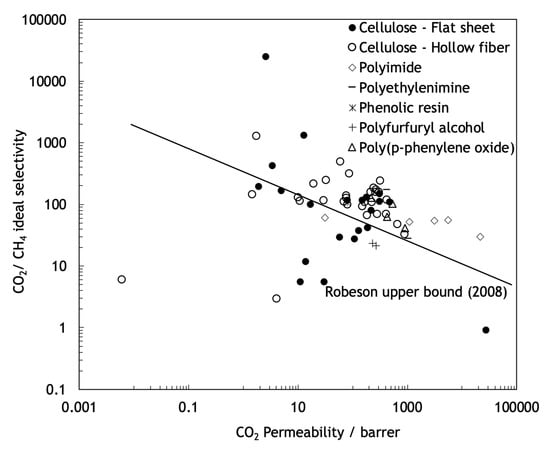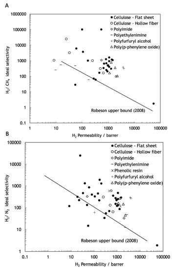 In carbon membranes made from cellulose, these pre-treatments are also applied systematically. Lie et al. have hydrolyzed wood pulp in trifluoracetic acid (TFA) to produce cellulose-based CMSM [,]. Various hydrolysis pre-treatment times, defined as the time from cellulose dissolution in TFA until film drying in a vacuum oven, were tested (6, 14 and 74 days), and their influence on the membrane permeability/selectivity was assessed. An increase in the exposure time to TFA was found to increase the carbon yield during carbonization, i.e., decrease the mass loss, leading to a general decrease in the permeability. However, this was accompanied by large increase of the selectivity for selected gas pairs and a general increase in the separation performance. For example, CMSM with hydrolysis pre-treatment time of 74 days displayed performance for CO2/CH4 separation, well above Robeson’s upper bound with a Robeson Index of 2.2. By contrast, TFA exposure for just 6 days resulted in non-selective CMSM with CO2/CH4 separation performance well below Robeson’s upper bound ( = 0.1). These results also demonstrated that furans released during carbonization play an important role as intermediates in the formation of microporosity [].