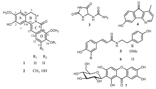 The stem and leaves showed similar TLC profiles, but the leaves contained large amounts of chlorophylls. The dried stem of (1.1 kg) was chopped and extracted with MeOH at room temperature to give a methanol extract of 180 g after the removal of the solvent. This MeOH extract was treated with EtOAc, n-butanol, and water to give corresponding extracts. The EtOAc extract was fractionated by vacuum-liquid chromatography on silica gel (hexane-CH2Cl2 and CH2Cl2-MeOH, gradient) to give six fractions (A-F). Fraction B was further separated on Sephadex LH-20 (MeOH) to obtain five fractions (BI-BV). The separation of fraction BII by repeated column chromatography (CC), including reverse-phase CC (C18, MeOH-H2O, gradient) and normal phase CC (silica gel; hexane-acetone, gradient), gave compound 1 (3.5 mg), compound 2 (3.4 mg), allatoin (3, 32.6 mg), and oxylopinine (4, 6.5 mg). Fraction D was separated on Sephadex LH-20 (MeOH) to give four fractions (DI-DIV). N-trans-Feruloyl tyramine (5, 28.4 mg) was isolated from fraction DIII through purification on CC (silica gel; hexane-acetone, gradient). Fraction E was separated on Sephadex LH-20 (MeOH) to give N-trans-p-coumaroyl tyramine (6, 6.1 mg). Mangiferin (7, 1 g) was obtained as white precipitates from the BuOH extract after it was left standing overnight. It should be mentioned that alkaloids 1 and 2 were quite unstable, as could be seen from their spots on the SiO2 TLC plate turning brown in a few minutes. Their purity should be in the range of 90–95%, as estimated from the appearance of the 1H NMR spectra.