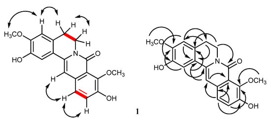 Compound 1 was obtained as a brownish white powder. The molecular formula was determined to be C19H17NO5 from the deprotonated molecular ion [M-H]− at m/z 338.1029 (calcd. for C19H16NO5 338.1028) in the HR-ESI mass spectrum. The UV spectrum displayed maximal absorptions at 225, 335, and 370 nm, characteristic of the 8-oxoprotoberberine skeleton []. The presence of the lactam functionality was supported by the IR band at 1667 cm−1 and the 13C NMR signal at δ 159.9 (Table 1).