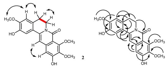 Compound 2 had a molecular formula of C20H19NO6, as deduced from the [M-H]− at m/z 368.1129 (calcd. for C20H18NO6 368.1134) in the HR-ESI-MS. The UV absorptions and IR bands of 2 were similar to those of 1, suggesting an 8-oxoprotoberberine structure. The COSY spectrum showed vicinal coupling for the methylene protons at C-5 and C-6 (Figure 3). It could be inferred from the molecular mass that compound 2 possesses an additional methoxy group, in comparison with 1. This was supported by the HSQC correlation peaks observed for three methoxy groups at δH 3.88 (3H, s)/δC 56.3, δH 3.90 (3H, s)/δC 61.5, and δH 3.90 (3H, s)/δC 61.9, and for four aromatic methines at δH 7.33 (1H, s, H-1)/δC 112.0, δH 6.90 (1H, s, H-4)/δC 111.4, δH 6.85 (1H, s, H-12)/δC 107.3, and δH 6.80 (1H, s, H-13)/δC 100.7 (Table 1). Similar to 1, compound 2 had a phenolic and a methoxy group located at C-2 and C-3 of ring A, respectively, as evidenced by the NOESY cross peak between the methoxy protons at δ 3.90 and the H-4 proton at δ 6.90 (Figure 3). The two remaining methoxy groups of 2 should be placed at C-9 and C-10, since none of these methoxy protons showed NOESY interaction with H-12 (Figure 3). This was supported by the HMBC correlations from H-12 to C-10 (δ 141.5) and C-11 (δ 155.2) (Figure 3). Thus, 2 was determined to be a new compound, having the structure 2,11-dihydroxy-3,9,10-trimethoxy-5,6-dihydro-8H-isoquinolino[3,2-a]isoquinolin-8-one and given the name huberanthine B.