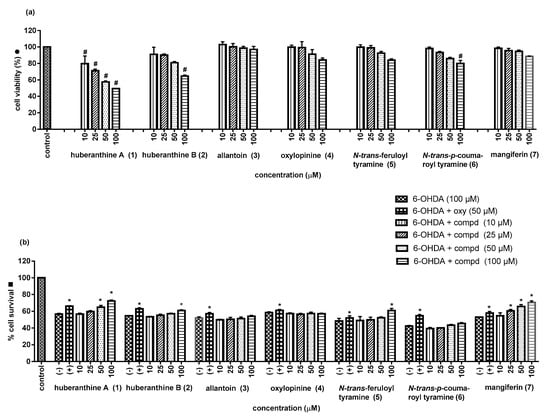 (a) Cell viability (● = 24 h incubation with test sample without 6-hydroxydopamine (6-OHDA)) and (b) cell survival (■ = 2 h incubation with 6-OHDA after 1 h of pretreatment with test sample); * A p < 0.05 is considered to be significantly different from the negative control (6-OHDA 100 µM); # less than 80% cell viability is considered cytotoxic; (−) = negative control (6-OHDA 100 µM); (+) = positive control (6-OHDA 100 µM and oxyresveratrol 50 µM).