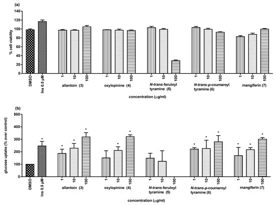Allantoin (3) and mangiferin (7) have been earlier reported for cellular glucose uptake enhancing activity [,], but oxylopinine (4) and N-trans-coumaroyl tyramine (6) have been studied for the first time in this investigation.