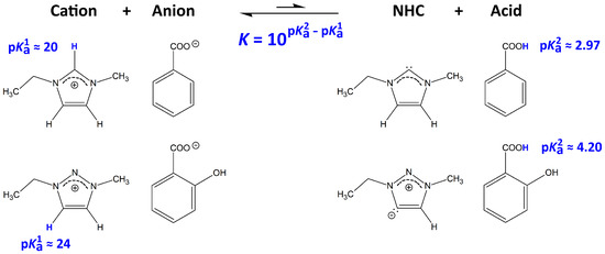 Process of N-heterocyclic carbene (NHC) formation for the ions involved in this study. The transferred protons are shown in blue color. p values are from the literature [44]. While p describes the acidity of the cation, p depicts the acidity of the acid corresponding to the anion after protonation. From the equation below the arrow, the equilibrium constant K of this process can be computed from the choice of anions and cations.