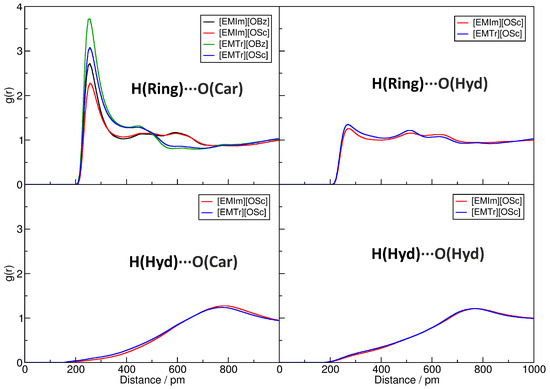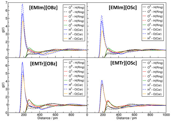 It is well known that hydrogen bonds play a significant role in imidazolium- and triazolium-based ILs [29,30,31,32,33,34,35,38]. Figure 3 presents the radial distribution functions (RDFs) between several hydrogen bond donors and acceptors in the investigated systems (for the atom labels, see Figure 1). The RDFs are normalized to uniform density: a value below one indicates a depletion of the observed atom type at the given distance, while values above one stand for an enrichment. Hydrogen bonds are characterized by a distinct peak at O⋯H distances of around 200 to 300 pm. In the upper left panel of Figure 3, the RDFs corresponding to the hydrogen bonds between the imidazolium and triazolium ring protons and the carboxylate oxygen atoms of the anions are depicted. It is clearly visible that all four ILs possess a distinct peak at typical hydrogen bond distances here, and we therefore can deduce that hydrogen bonding between these atoms is strong and important in the liquids. The intensity of the hydrogen bond is stronger for triazolium cations when compared to imidazolium and is slightly stronger for benzoate anions in comparison to salicylate. While the former observation can be understood from the fact that there are less ring protons in triazolium, and therefore each single interaction is more intense, the latter finding is due to the competition for the hydrogen bond acceptors because of intramolecular hydrogen bonding in salicylate. The competition between hydrogen bond donors and acceptors will be further discussed in Section 2.4. The position of the peak is around 230 pm for all systems, as is expected for aromatic C–H⋯O hydrogen bonds.