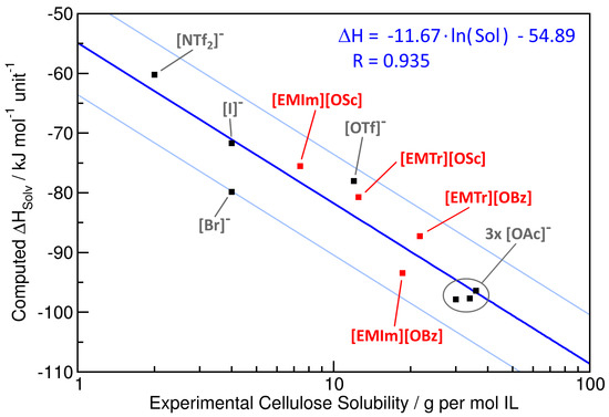To further investigate the correlation between experimental cellulose solubility and computationally predicted solvation enthalpy, we present a correlation plot for these two properties in Figure 6 (note the logarithmic horizontal axis for the cellulose solubility). While the four red points correspond to the ILs from this study, the seven black points have been taken from our previous article [38]. Already at first sight, a clear correlation between the quantities can be seen. A least-squares regression of the points is shown by the blue curve, and the corresponding equation is given in the upper-right corner of the plot (note that a logarithmic function appears as a straight line with a logarithmic horizontal axis). The correlation coefficient of the regression is , indicating a rather good fit. The two light blue lines indicate the range of a factor of two deviation between predicted and experimental cellulose solubility. All points are located within this range. Therefore, we can conclude that our simple model can give a semi-quantitative prediction of cellulose solubility from molecular dynamics simulations, with a deviation between prediction and actual value less than a factor of two in all cases.