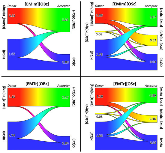 Sankey diagrams [53] visualizing the topology of the hydrogen bond network for the cellulose solution in the four ILs (one panel per IL). Hydrogen bond donors shown on the left side and acceptors on right-hand side. The numbers indicate the average hydrogen bond count per atom. For atom labels, see Figure 1.