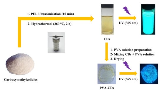 Figure 1 shows a schematic representation of CDs and PVA-CDs composite development. CMC, as a green and economic resource, is used as a carbon precursor for the production of fluorescent CDs. In contrast to other lignocellulosic materials reported in the literature [27,29], CMC of empty fruit bunches is enriched with ether and hydroxyl moieties which could play a major role in the enhancement of substitution degree and carbonization acceleration. Branched PEI was selected as a dopant for its feature to inject electron-rich N into the final framework of CDs and increasing QY with the ability to capture metal ions [9]. The as-formed CDs exhibit a yellow color, showing greenish emission under UV-lamp (365 nm), good water solubility and long shelf-life (up to 1 year) with no apparent agglomeration. These CDs were encapsulated with PVA polymer host to develop a solid-state hybrid film for heavy metal complexation in an attempt to overcome the separation issues of the liquid phase [4]. In comparison to the liquid CDs, the as-obtained film is transparent under daylight while they exhibited a bright blue emission under UV exposure. This transformation from greenish to blue could be due to the formation of hydrogen bonds from the numerous interactions of CD surface sites and the PVA substrate [41,49].
