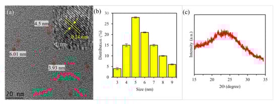 Figure 2 show the TEM, HRTEM and XRD results of the CDs. TEM images (Figure 2a) reveal that the obtained CDs have a monodispersed spherical structure, with an average size of 4.1 nm. Based on the HRTEM images (inset of Figure 2a), these nanodots have high crystallinity domains, demonstrating the presence of a graphitic inner core. The well-resolved lattice fringes show an interplanar distance of 0.24 nm, which is close to the (100) facet of graphite, similar to previous reported studies [50,51,52]. Based on the particle size distribution histogram, which was calculated from one hundred nanoparticles (Figure 2b), the CDs have a size distribution ranging from 3 to 9 nm with an average diameter of about 4.2 ± 0.5 nm. The XRD data displayed a diffraction peak at a 2Ɵ value of 23.8° attributed to the (002) lattice spacing of graphitic-like carbon, in line with other works [50,51,52,53]. The measured zeta potential of the CDs (Figure S1) found to be −8.71 mV at pH 7, implying a negatively-charged CDs edges.
