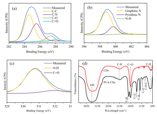 Figure 3. The high-resolution XPS survey of (a) C1s, (b) N1s and (c) O1s, (d) FTIR spectra of CDs and PVA-CDs.