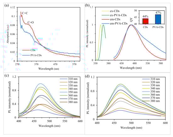 The PL spectra (Figure 3b) reveal that the excitation/emission maxima of PVA-CDs film were red-shifted by about 10 and 3 nm, respectively, compared to that of CDs. This may be due to the PVA environment, which can act as a surface passivation agent for CDs [64]. The QY of the developed PVA-CDs composite film was determined and found to be 47%, which is higher than that of CDs (inset of Figure 2b). The QY enhancement might be due to hydrogen bonding interactions in the PVA/CDs composite as suggested by the FTIR analysis (Figure 3b). This binding can produce plenty of physical crosslinking points for the CDs in the more confined environment of the PVA matrix, which provide a stabilization effect on the electron/hole pairs for more efficient radiative recombination, as reported in the literature [41,49,64]. The emission spectra (310–380 nm in range) of the CDs remained unshifted as the excitation wavelength was varied from 310–350 nm. Beyond 350 nm, a red-shift of the PL intensity was observed. The particle size selection and surface traps of CDs are the main factors responsible for the emission variation [27,51,65,66]. In contrast to the liquid CDs, PVA-CDs film exhibits only excitation-independent emission phenomena when exposed to varied excitation wavelengths (Figure 7c), which agrees with previous work [40]. This phenomenon is more favorable for a variety of applications as it prevents auto-luminescence [67].