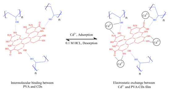 Efficiency improvements in heavy metal removal are mainly due to the PVA matrix, as previously reported [10,75,76,77]. Meanwhile, the reduction of Cd2+ on uncoated CDs could be explained on the basis of electrostatic attractions between Cd2+ centers and electron-rich functionalities around CDs. That means a metal-ligand complex is formed due to the donation effect of electrons from -COO, -OH and -N to the d-orbitals of metal, in line with previously reported works [48,78,79]. However, for the PVA-CDs membrane, a synergetic adsorption activity was noticed. The adsorption/desorption mechanisms of Cd2+ ions are illustrated in Figure 6. Recent investigations show that PVA-CDs film favored the rapid adsorption of Cd2+ by providing more -OH sites for target metal ions [70,75,76,77]. According to the Pearson assumption, the affinity of heavy metals towards the available sites is ascribed to the soft acid–soft base binding, where the PVA–CDs act as a soft base and Cd2+ as a soft acid [4,80].