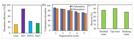 The regeneration and reusability performance of the adsorbent was studied to evaluate its activity for practical use. First, recycling experiments to recover the adsorbed Cd2+ were conducted using urea (0.1 M), HCl (0.1 M), EDTA (0.1 M) and NaCl (0.1 M). As shown in Figure 7a, the results revealed the superior effectiveness of HCl to recover Cd2+ from PVA-CDs, consistent with a previous study [84].