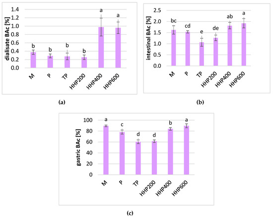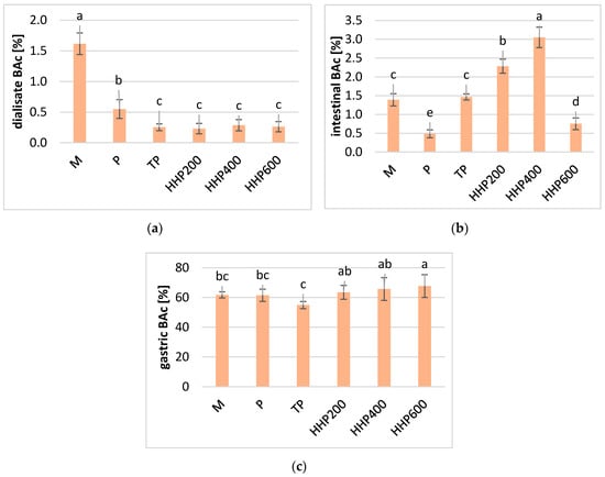 Relative bioaccessibility of total anthocyanins in blackcurrants after different processing: M–crushed in a mortar; P–untreated puree; TP–thermal-treated puree; HPP200–high-pressured puree at 200 MPa; HPP400–high-pressured puree at 400 MPa; HPP600–high-pressured puree at 600 MPa; (a) in the dialysate stage; (b) in the intestinal stage; (c) in the gastric stage; small letters a–d indicate statically significant differences in the mean values between samples at a confidence level of α = 0.05.
