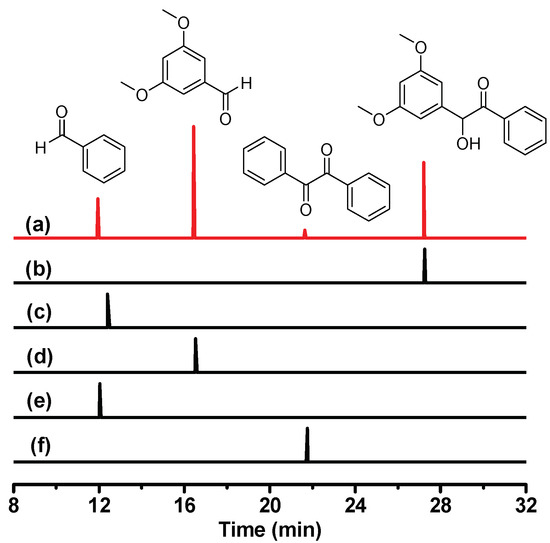 GC (gas chromatography) traces in MeCN of (a) DMB after 266 nm irradiation; (b) DMB; (c) benzoic acid; (d) 3,5-dimethoxybenzaldehyde; (e) benzaldehyde; (f) benzil.