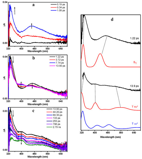 The fs-TA (femtosecond transient absorption) spectra of DMB in MeCN acquired after 266 nm irradiation (a) from 0.19 ps to 1.08 ps, (b) from 1.22 ps to 13.9 ps, (c) from 13.9 ps to 2.79 ns; (d) Comparison between the calculated absorption spectra of DMB (S1), DMB (T nπ*), DMB (T ππ*) and the fs-TA spectra recorded at 1.22 ps and 13.9 ps. The calculations were performed at the TD-B3LYP/6-311 + g(d,p) (MeCN) level of theory. The scale factor is 1.05 (applied to energy (x-axis)) and the half-width is 1000 cm−1.
