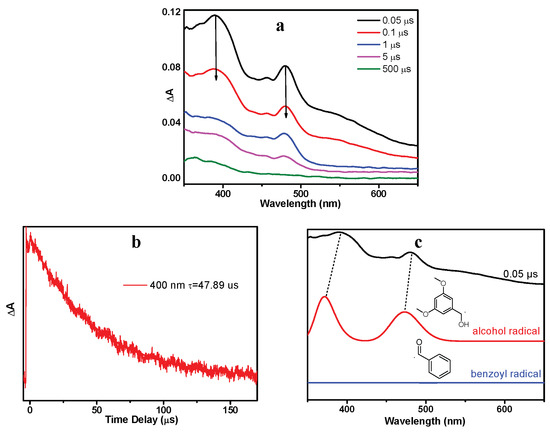 As shown in Figure 6a, a new species with a maximum absorption band at 400 nm and a shoulder band at 480 nm were observed (denoted as X480). Species X480 was long-lived and its decay time constant was determined to be 47.9 µs (Figure 6b). Figure 6c (red line) presents the simulated absorption spectrum for dimethoxy-benzyl alcohol radical (OMe-R), which exhibits great resemblance with the ns-TA spectrum of DMB in MeCN recorded at 0.05 μs. Therefore, the species X480 is assigned to the alcohol radical generated by DMB (T nπ*). Benzoyl radical (Ben-R), the counterpart species of the alcohol radical, is not recognized in the spectra because it does not absorb in this spectral region (Figure 6c blue line), which agrees well with previous literature reports [19]. The proposed reaction mechanism of the photochemical α-cleavage reaction of DMB in MeCN is presented in Scheme 2.