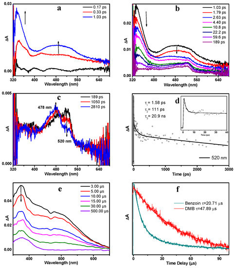 To compare and contrast with the photoexcited processes of DMB, the parent molecule benzoin was also studied using same experimental methods, and the results are briefly discussed here. As displayed in Figure 7a, upon 266 nm excitation, benzoin went to the Sn state and then relaxed to the S1 state via an IC process within 1.1 ps. The absorption bands of benzoin (S1) were maximized at 334 and 480 nm. As expected, the early spectra of benzoin resemble those of DMB significantly. As the delay time increased, benzoin (S1) decayed accompanied by the growth of a new species that possesses a weak absorption band at 520 nm (Figure 7b). This species is assigned to benzoin (T nπ*) based on similar results observed in previous studies [17,19]. Figure 7d depicts the kinetics trace monitored at 520 nm in MeCN and the decay dynamics can be well-fitted by three exponentials with the time constants of 1.58 ps, 111 ps and 20.9 ns. From 189 ps, the absorption band at 520 nm decreased in intensity while a sharp-pointed band at 478 nm increased in intensity (Figure 7c), which suggests a precursor-successor type of relationship between these two species. Therefore, this spectral variation is attributed to the α-cleavage process of benzoin (T nπ*) and the absorption band at 478 nm is assigned to the radical generated via this α-cleavage.