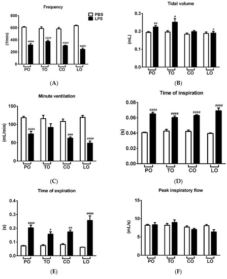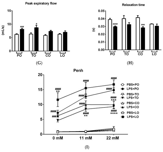Effects of thyme (TO), cinnamon (CO) and lemongrass (LO) essential oils on (A) breathing frequency, (B) tidal volume, (C) minute ventilation, (D) time of inspiration, (E) time of expiration, (F) peak inspiratory flow, (G) peak expiratory flow, (H) relaxation time and (I) Penh compared to the negative control paraffin oil (PO), after lipopolysaccharide (LPS - black columns)/phosphate-buffered saline (PBS - white columns) treatment. (n = 8–10/group, # p < 0.05, ## p < 0.005, ### p < 0.0005, #### p < 0.0001 vs. respective PBS-treated group, *p < 0.05, ** p < 0.005, *** p < 0.0005, **** p < 0.0001 vs. LPS-PO-treated mice).
