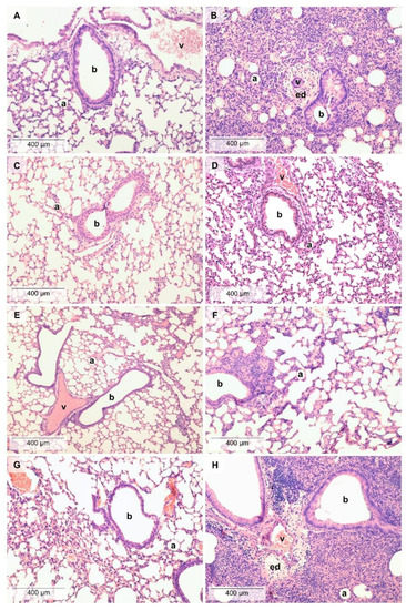 Histopathological alterations in the lung. Representative pictures of lung parenchyma after (A) PBS and PO treatment, (B) LPS and PO treatment, (C) PBS and TO treatment, (D) LPS and TO treatment, (E) PBS and CO treatment, (F) LPS and CO treatment, (G) PBS and LO treatment, and (H) LPS and LO treatment. (Hematoxylin–eosin staining, 200 × magnification; a: alveolus, b: bronchiole, v: vessel, ed: edema).