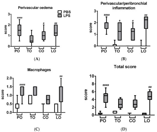 Semiquantitative evaluation of (A) perivascular and peribronchial edema, (B) accumulation of neutrophil granulocytes, (C) macrophages and (D) total score of lung histopathological alterations (n = 8–10/group, # p < 0.05, ## p < 0.005, #### p < 0.000 vs. respective PBS-treated group) are demonstrated in box plots showing the median, upper/lower quartile, and maximum/minimum values.