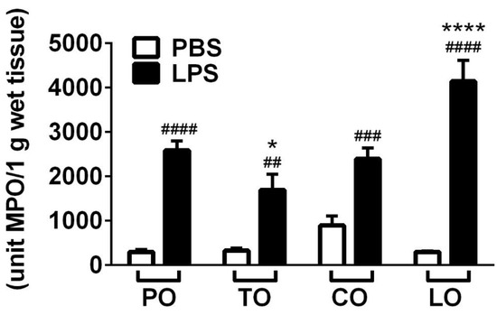 Results of myeloperoxidase (MPO) activity measurements. (n = 8–10/group, ## p < 0.005, ### p < 0.0005, #### p < 0.0001 vs. respective PBS-treated group, * p < 0.05, **** p < 0.0001 vs. LPS-PO-treated).
