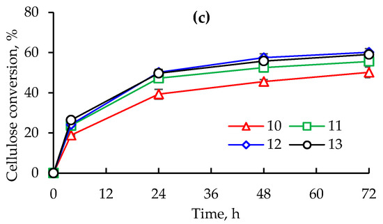 Time course of the enzymatic hydrolysis of steam-pretreated spruce at substrate loadings of 5% (a), 10% (b), and 15% (c). The numbers in the legend correspond to the experimental reactions as indicated in Table 2. Mean of three replicates. The error bars correspond to standard deviations.