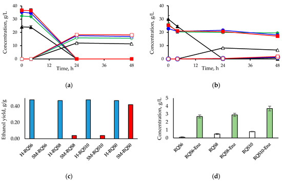 Fermentations of either the hydrolysate containing RQS added before enzymatic hydrolysis or synthetic medium with freshly added RQS were performed. The hydrolysate was produced using substrate loading 10% (w/w), enzyme loading 7.5 FPU, and 7.5 CBU/g substrate, and RQS dosages of either 6, 8, or 10 g/100 g DW substrate. The hydrolysate was supplemented with the following nutrients (in g/L): yeast extract (5), NH4Cl (2), KH2PO4 (1), and MgSO4∙7H2O (0.3). The synthetic medium contained (in g/L): glucose (20), yeast extract (5), and Bacto Peptone (5). The synthetic medium was supplemented with RQS in concentrations that were equivalent to the dosages used in the preparation of the hydrolysate medium. The pH of both media was adjusted to 5.0 with 10 M NaOH. The hydrolysate was filter-sterilized using Acrodisc syringe filters (Pall, Ann Arbor, MI, USA), while the synthetic medium was sterilized by autoclaving at 110 °C for 5 min. Eight mL of hydrolysate or 20 mL of synthetic medium in Erlenmeyer flasks were inoculated with 1 g/L of yeast cells, and the fermentations were carried out at 30 °C and 150 rpm for 72 h. Samples were taken after 4, 24, 48, and 72 h of fermentation. All fermentations were performed in triplicates.