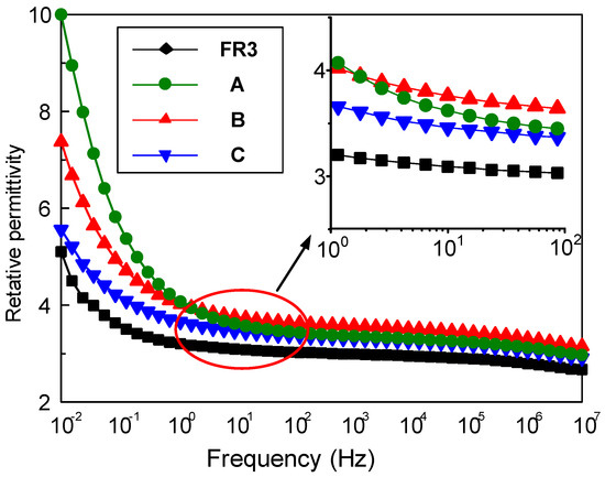 The relative permittivity and dielectric loss of nanofluid impregnated paper were measured by the broadband dielectric spectrum (Concept 80, Novocontrol Technologies GmbH &Co, Cologne, Germany). Figure 1 shows the frequency dependence between the relative permittivity for FR3 impregnated paper and the three nanofluid impregnated papers. It can be seen that the relative permittivity of the nanofluid impregnated paper is significantly higher than that of FR3 oil. At 50 Hz, the relative permittivity of FR3 oil impregnated paper is 3.2, while the relative permittivity of sample A is 3.5. As is well known, the relative permittivity of Fe3O4 nanoparticles is ca. 80 [16], which is much greater than that of insulating paper, and this causes the relative permittivity increase for nanofluid impregnated paper.