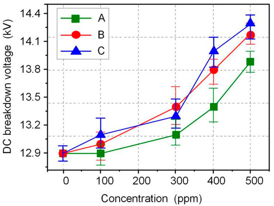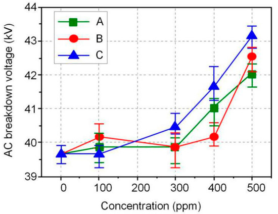 The AC and DC breakdown voltages of nanofluid impregnated paper samples were measured in accordance with ASTM D149 and D3755, and the results are shown in Figure 3 and Figure 4. FR3 oil impregnated paper is recorded as an Fe3O4 nanoparticle 0 ppm nanofluid impregnated paper sample. The results show that Fe3O4 nanoparticles can significantly increase the breakdown voltage of nanofluid impregnated paper. The maximum AC breakdown voltage of Fe3O4 nanofluid impregnated paper is 43.2 kV, which is 9.1% higher than that of FR3 oil impregnated paper. The maximum DC breakdown voltage of Fe3O4 nanofluid impregnated paper samples is 14.2 kV, which is also 10.0% higher than the DC breakdown voltage of FR3 oil impregnated paper. Comparing the AC and DC breakdown voltage of the impregnated paper samples, it can be found that within a certain range, the increase of Fe3O4 nanoparticle size will increase the breakdown voltage of the nanofluid impregnated paper samples.