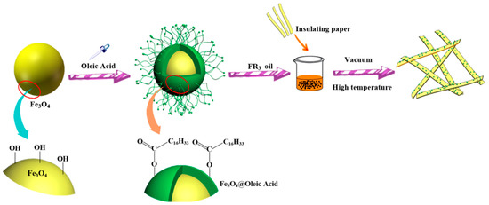 The process of preparation of nanofluid impregnated paper is shown in Figure 6. The nanofluid impregnated paper was obtained via three main procedures: synthesis of Fe3O4 nanoparticles, synthesis of Fe3O4 nanofluids, and preparation of impregnated papers.
