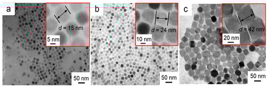 The average size of the Fe3O4 nanoparticle in Figure 7a is estimated as ~15 nm. With longer reaction time, i.e., from 24 to 72 h, three different sized Fe3O4 nanoparticles were obtained with varying diameter from ~15 (Figure 7a) to ~42 nm (Figure 7c) via ~24 nm (Figure 2B).