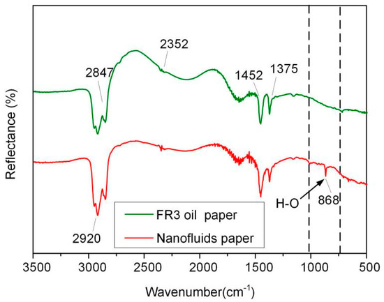 In order to further analyze the bonding between Fe3O4 nanoparticles and paper fibers, the FR3 impregnated paper and nanofluid impregnated paper were tested by attenuated total reflection Fourier infrared spectroscopy (ATR-FTIR, Nicolet, Thermo Electron Corporation, Franklin, TN, USA), and the results are shown in Figure 9. In the spectrum, symmetric and asymmetric vibration peaks of –CH2 and –CH bands appear at 2847, 2920, 1452, 1375 cm−1, respectively, and the stretching vibration absorption of C=O band at 2352 cm−1 appears in the spectrum. These indicate the presence of insulating oil molecules or oleic acid in the paper fiber. It is worth noting that, a new absorption band of an O–H group 868 cm−1 appears in the nanofluid impregnated paper, indicating the bonding of Fe3O4 nanoparticle onto the surfaces of the paper fiber.