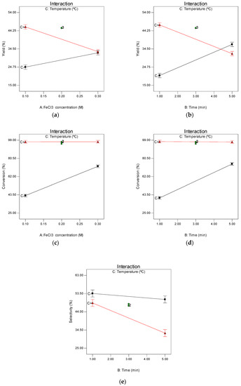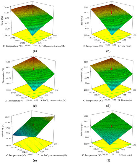 | Maximise | A: FeCl3 (M) | B: Time (min) | C: Temp. (°C) | Yield (%) | Conversion (%) | Selectivity (%) |